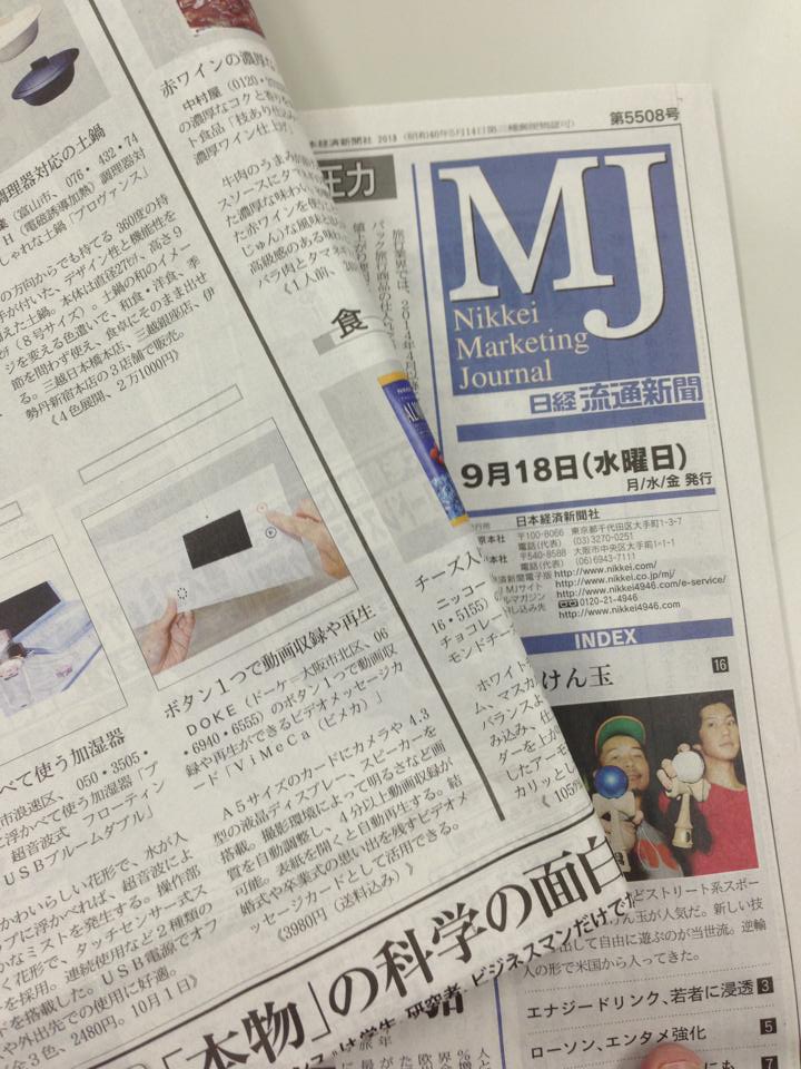 本日、2013年9月18日の日経MJ新聞に“ビデオメッセージカード「ViMeCa」(ビメカ)”の記事が掲載されました。今後も色々なメディアから取り上げて頂ける様に邁進してまいりますので、今後とも宜しくお願い致します。